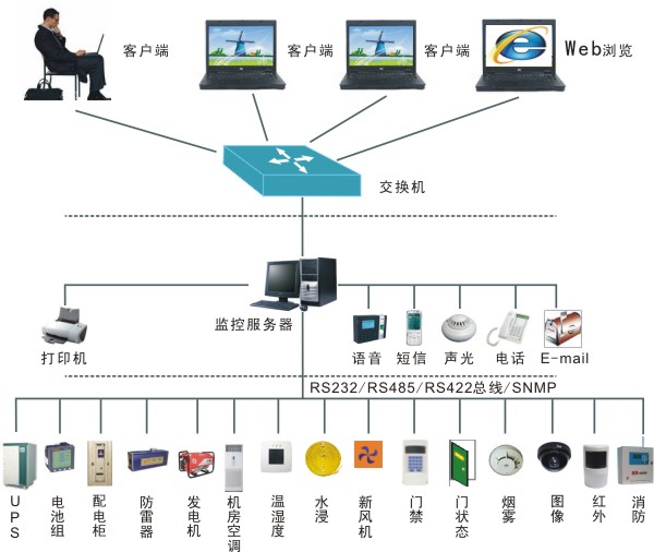 動(dòng)力監(jiān)控系統(tǒng):配電柜、UPS、發(fā)電機(jī)、蓄電池、防雷等實(shí)時(shí)監(jiān)控;